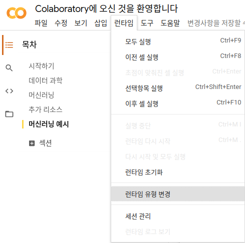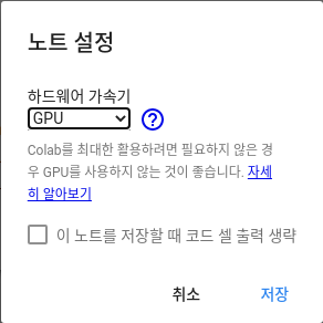 '런타임 - 런타임 유형 변경 - 하드웨어 가속기 (GPU)' 이 순서대로 하시면 앞으로 어떤 학습을 할때 GPU로 학습을 하게 됩니다.