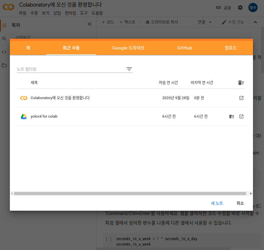 그리고 이 colab은 구글 드라이브와 연동하여 사용하는데 이 부분에 대한 설명도 시간 여유가 생기면 포스팅 하겠습니다.
