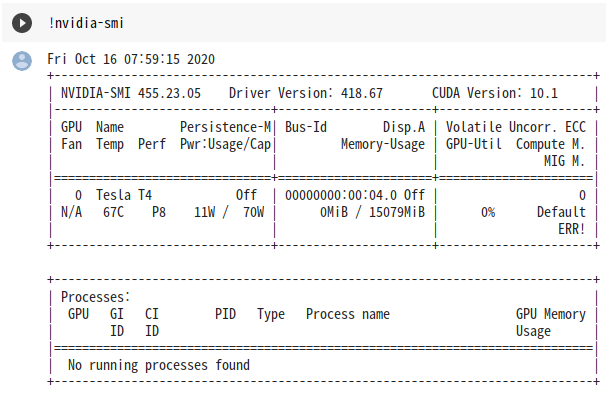위에서는 테슬라의 T4 그래픽 카드가 할당되어 있는데 무료버전은 그래픽카드가 P100, T4 등으로 랜덤하게 할당됩니다. 글을쓰면서 진행했는데 그새 그래픽 카드의 종류가 바뀌었네요.