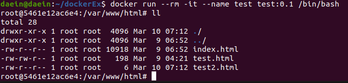 이제 이 test 이미지로 run 명령어를 실행하면 실제로 사용할 수 있는 컨테이너가 만들어지게 됩니다.