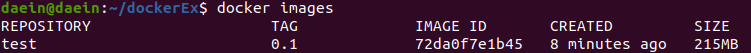 해당 명령어로 이미지를 확인하면 test라는 이름으로 0.1 태그를 가진 이미지가 생성되게 됩니다.